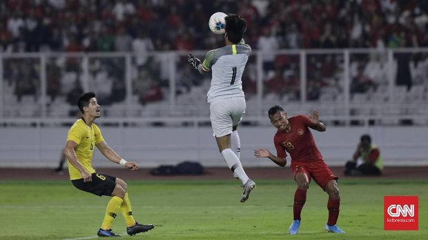 Kiper Malaysia Farizal Marlias menjemput bola di udara. (CNN Indonesia/Adhi Wicaksono) |
