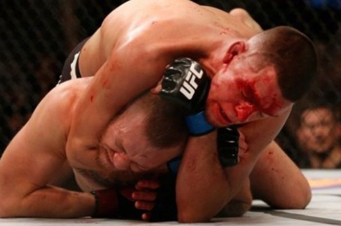 Petarung Amerika Serikat, Nate Diaz, mengunci leher petarung asal Irlandia, Conor McGregor pada UF