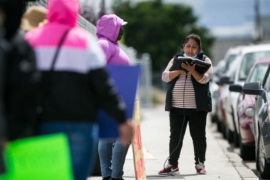 Hansen Fruit workers had to relocate after the company prohibited activity at a previous site near the plant’s parking lot off East Washington Avenue, said Edgar Franks, political director at Familias Unidas por la Justicia, a farmworkers union based in Skagit County. Workers moved to an area in front of the plant on East Mead Avenue.