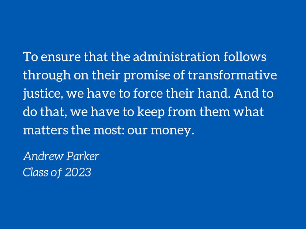 To ensure that the administration follows through on their promise of transformative justice, we have to force their hand. And to do that, we have to keep from them what matters the most: our money. The fact is, Duke is a mostly wealthy and white university. According to its website, 48 percent of undergraduate students can afford to pay full tuition. To that 48 percent, and especially to wealthy white students: You have the most power to make demands and create transformative change for the entire student body.