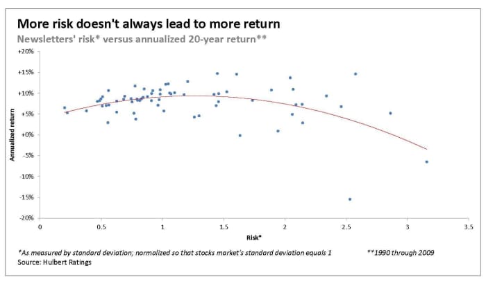 Take a look at the accompanying chart, which plots the riskiness and the annualized returns of each of the investment newsletter portfolios monitored by the Hulbert Financial Digest from 1990 through 2009. I chose to focus on this 20-year period because it includes two powerful bull markets (1990-1999 and 2002-2007) along with two major bear markets (2000-2002 and 2007-2009). If risk and reward were related in the way that conventional wisdom would have us believe, the trend line that best fits the data would be upwardly sloping.